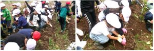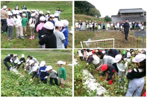 昨年は悲しいことにイノシシにやられてしまい、自分たちで植えた苗でいもほりができませんでしたが、今年は6月末の学校だよりでお伝えしたように「蜂屋まちづくり協議会」の方にイノシシよけの柵を作っていただいたのでイノシシの被害に遭うこともなく、無事、収穫の時期を迎えることができました。