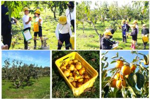 今回は、今が収穫時の柿畑の様子を見に行きました。昨年は猛暑とカメムシで今ひとつだったそうですが、今年は猛暑のわりになかなかの出来だそうで、立派に実ったたくさんの柿がありました。柿について教えてくださる地域の方に、来月に行う柿むきについても教えていただきました。