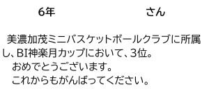 <表彰> 6年生女子(美濃加茂ミニバスケットクラブ所属) BI神楽月カップ 3位