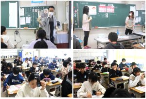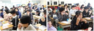 6年生の課題は「歯周病を防ごう」です。健康な歯ぐきと歯周病の歯ぐきを写真などで比べて、歯周病の恐ろしさを教えていただきました。そして、歯周病を予防するには歯間まで意識した丁寧な歯磨きが大切で、その磨き方も教えていただきました。