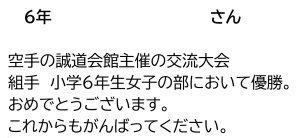 <表彰> 6年生女子 誠道会館主催空手交流大会 組手 小学6年生女子の部 優勝