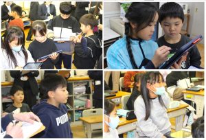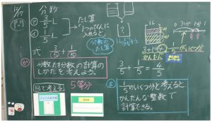 授業では分数のたし算の計算の仕方を考えました。・・・集中して聞く姿や積極的に挙手する姿も素敵でしたが、タブレットを活用して仲間との意見交流を通して、課題を解決していく姿がとっても素敵でした。最初は分母を足していた子も、最後は〇分の1が何個分ということが大切なことに気づけました。