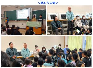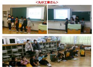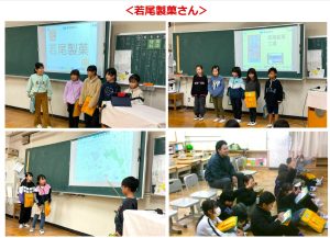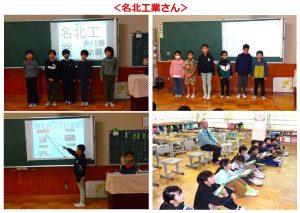 9月に4つのグループに分かれて、校区内の工場を見学した3年生ですが、自分たちのグループが見学を通して学んだことを発表しました。発表会には見学をさせていただいた、名北工業さん・アルテミア製缶さん・若尾製菓さん・丸杉工業さんからも駆けつけてくださりました。タブレットを使ってプレゼンをしたり、クイズを交えて分かり易く発表したりする姿に皆さん感心していました。
