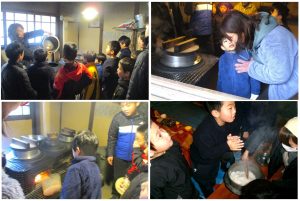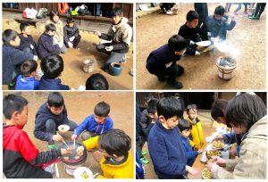 かまどでごはんをたいておにぎりにして、七輪でいろんなおかずを焼いておいしく食べることが一番の目的です。みんなで協力したのでとっても上手にできました。「おにぎりキャンペーン」の成果ですね。とってもとってもおいしかったです。