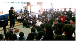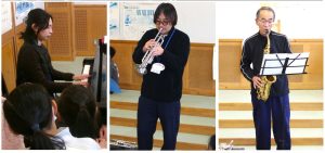 演奏会の案内はその日の給食時間に伝えられました。もちろん休み時間なので、自由参加ですが、会場の音楽室には、たくさんの蜂屋っ子が集まりました。校務員さんがサックスを演奏し、二人の先生がトランペットとピアノのコラボ演奏を披露しました。