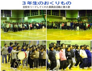 今年のスローガンは「とどけよう 感謝・感げき・感動」です。下級生はどの学年も6年生に感謝の気持ちを伝えようと、精一杯頑張りました。感謝を伝えられた6年生は大いに感げきしていました。そして会場全体が温かい雰囲気になり、参加しているみんなが感動する本当に素敵な会になりました。