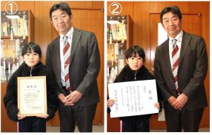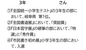 <表彰> 3年生女子 『全国統一小学生テスト』 岐阜県 第1位 / 『全国書道展』 「奨励賞」 /『日本習字展』「特選」・「秀作賞」 /『市民書き初め展』小学3年生の部 入選