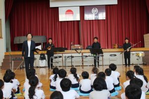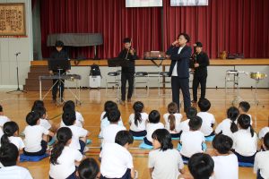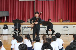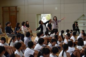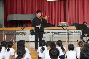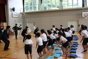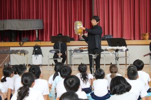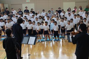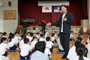 10月31日に名古屋フィルハーモニー交響楽団の公演が、本校の体育館で開催されます。本公演を前に、今日は、テノール歌手、打楽器、木管楽器、弦楽器の奏者の方に来校していただき、ワークショップを行っていただきました。オーケストラを構成している楽器の紹介と演奏、テノール歌手の方による歌声の披露、そして、児童全員によるボディーパーカッションとオーケストラと共演する合唱曲「ビリーブ」の練習をしました。4名による演奏でしたが、それでもプロの演奏を生で聞き、その音の綺麗さや繊細さ、迫力の素晴らしさを体感することができました。本公演では、60名の団員による生演奏を聴くことができます。当日がとても待ち遠しくなりました。