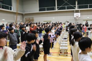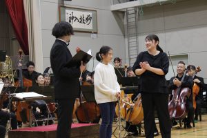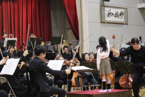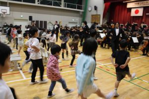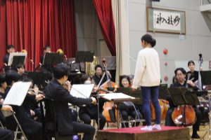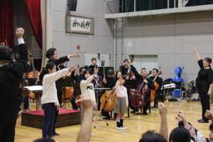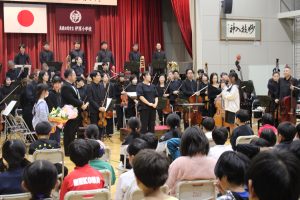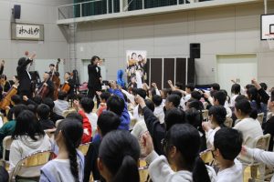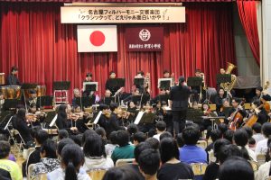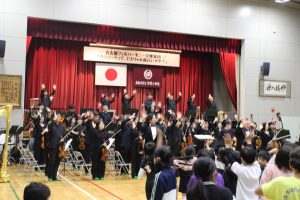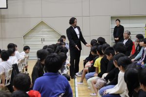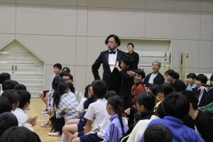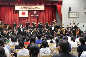 10月31日、文化庁の舞台芸術等総合支援事業による名古屋フィルハーモニー交響楽団の学校巡回公演が、本校の体育館で開催されました。「クラシックって、どえりゃあ面白いがや!」をテーマとして、60名の楽員と3名の男性オペラ歌手の皆さんによる12曲におよぶ素晴らしい公演をしていただきました。オーケストラと共演した「ビリーブ」の合唱や「フレンチ・カンカン」の曲に合わせて行うボディーパーカッションなど、子どもたちもとても楽しむことができました。公演の最後には、オーケストラの演奏で歌った校歌は、最高の思い出となりました。