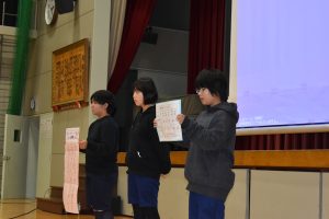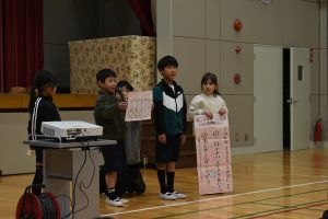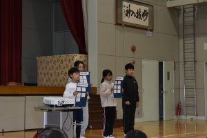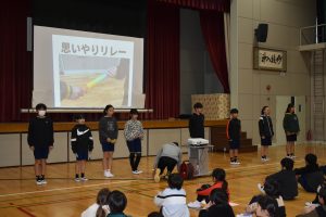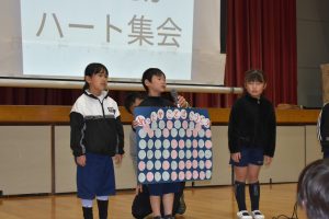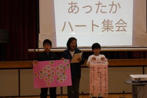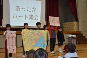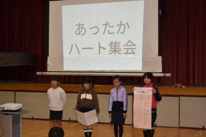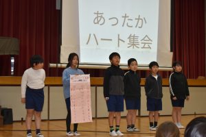 人権教育「ひびきあい活動」の一環として、児童会が中心となって「かがやき見つけ」や「あったかハート宣言」の取組を10月から行ってきました。今日は、各学級の取組内容とその成果を発表しました。この児童会の活動を通して、クラスに「笑顔が増えた」「とてもあたたかなクラスになった」など、伊深小学校全体として、思いやりのある姿がたくさん見られました。