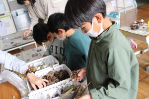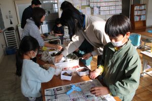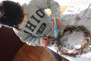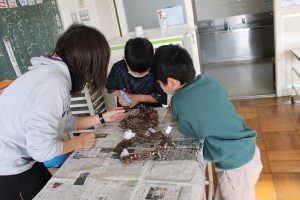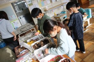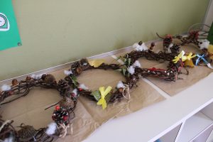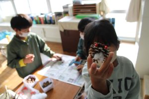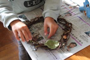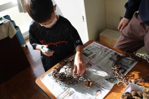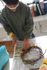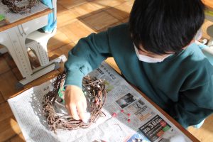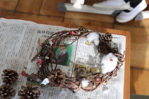 1年生の図工で、クリスマスのかざりを作りました。リースには、サツマイモを収穫した時のつるを使いました。秋見つけで見つけた松ぼっくり、どんぐり、落ち葉、木の実などを飾りつけの材料にして、クリスマスリースや松ぼっくりクリスマスツリーなどを楽しみながら作りました。