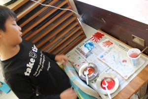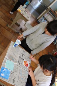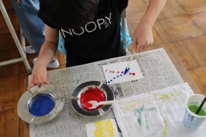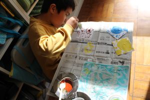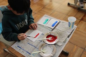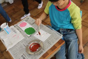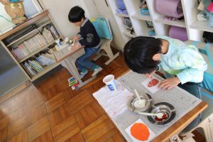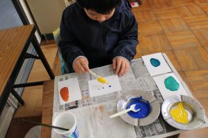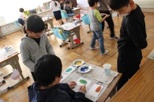 2年生の図工では、水彩絵の具を使った「出会って生まれる色の世界」という題材で、2種類の色を混ぜてできる色の世界を体験しました。思い思いに2種類の色を混ぜ合わせ、そこから生まれる別の色を楽しみました。