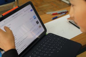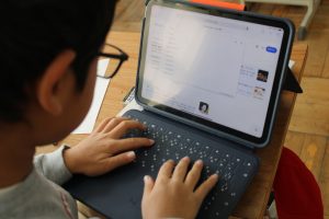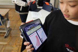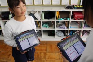 今年度から新しくなったタブレット端末をいろいろな学習で活用しています。調べ学習で情報収集に使ったり、課題に対する考えを書いて、画面を見せて説明しあったりしています。その他に、プログラミングや算数の計算問題にチャレンジしたりと、毎日いろいろな場面でタブレット端末を活用しています。