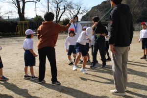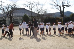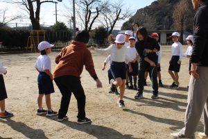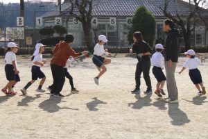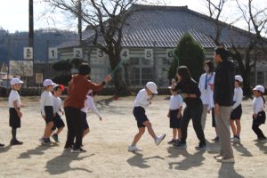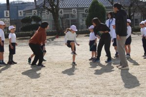 1・2年生の体育の学習では、大繩を使った8の字跳びの練習をしています。まわっている縄に入るタイミングをとることがなかなか難しいのですが、練習を繰り返すことで、スムーズに入れるようになってきました。これから、もっともっと上手になっていくでしょう。