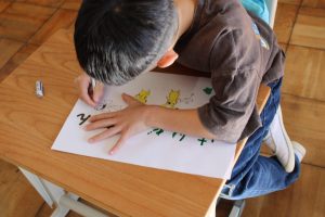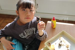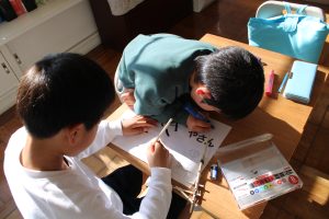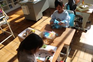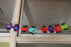 1年生の生活科では、今週2年生を招いて、おもちゃまつりを行う計画をしています。そこで使うかざりや看板などを作りました。