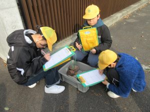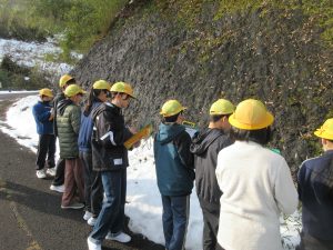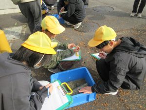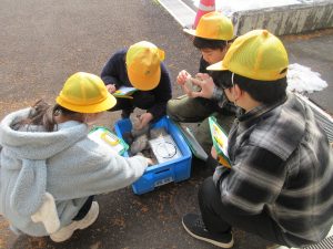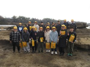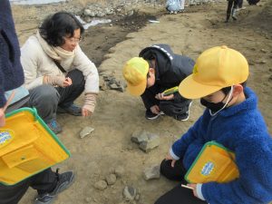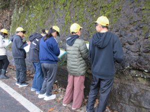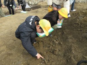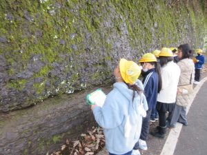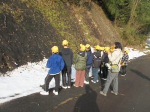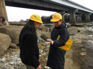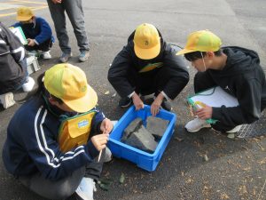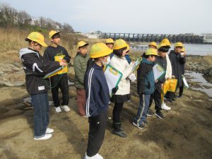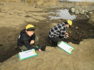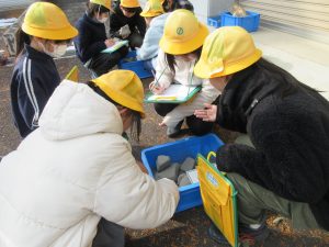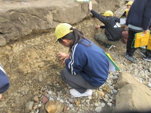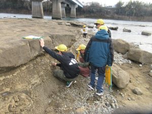 6年生の理科では「大地のつくりと変化」の学習をしています。今日は、文化の森を活用した学習で、地層の見学や化石採取の体験をしました。蜂屋町に見られる火山活動でできた地層を見たり、木曽川沿いで植物の化石を採取したりしました。