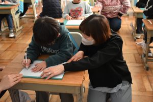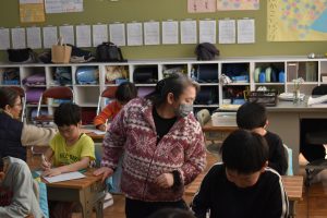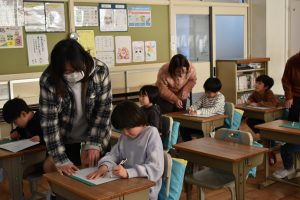 2年生の図工「まどをあけたら」の題材で、カーターを使います。小学校で初めてカッターを使用して作品づくりをします。今日は、その初日でした。まずは、カッターを使って、工作用紙に切れ目を入れて、三角形や四角形、半円などのまどを作る練習をしました。初めて授業でカッターを使うので、ボランティアとして5名の保護者の方に来ていただき、安全に作業ができるように、見守りをしていただきました。