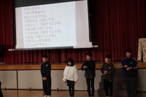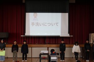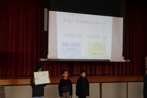 風邪予防週間の取組について、健康委員会から呼びかけがありました。手洗いの仕方や教室内の換気について、映像を使ってわかりやすく説明してくれました。本校では、今シーズンインフルエンザによる学級閉鎖は、1クラスもありません。これからも、インフルエンザの感染拡大防止に取り組んでいきます。
