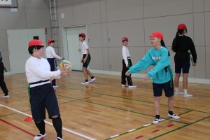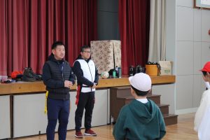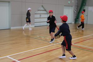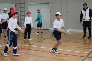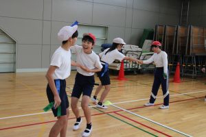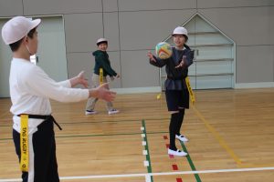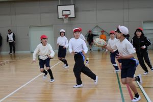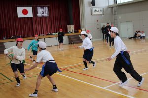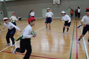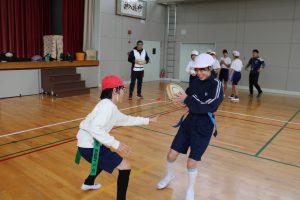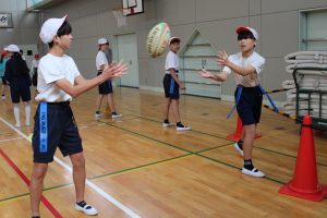5・6年生は、トップアスリートによる体験学習を行いました。今回、朝日大学のラグビー部監督とコーチに来ていただくことができました。体育の学習でも行えるタグラグビーを教えていただきました。ボールが楕円で、下から投げること。自分より後ろにいる仲間にしかパスできないこと。自分のタグを相手に取られると動けなくなることなどを教えていただきました。基本的は動きとルールを学んだあと、実際にゲームをしました。はじめは自分より後ろにいる仲間にパスすることがなかなかできませんでしたが、徐々に慣れてきて、チームで作戦を立てて、楽しむことができました。