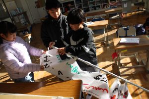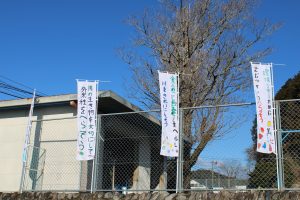 4年生の総合的な学習では、伊深町の環境について、学習を進めてきました。今回、伊深町の素晴らしい環境をいつまでも大切にしていきたいという思いから、のぼり旗を作成し、地域の皆さんに呼びかけようと考えました。のびり旗にこれからも伊深町の環境を守っていたいという思いを登旗の込めて作成しました。のぼり旗は、学校のフェンスに取り付けて、地域の皆さんに啓発したいと思います。