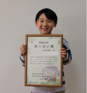 美濃加茂市教育委員会による第19回あじさい賞の表彰式が行われました。岐阜県小学生陸上競技選手権大会男子1年50m第1位になったということで、あじさい賞を受賞することになりました。素晴らしい活躍でした。