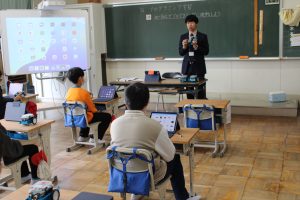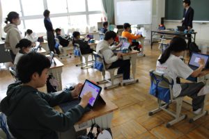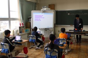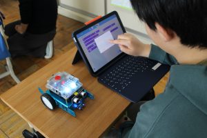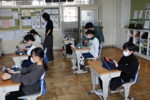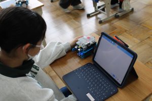 5年生では、理科の学習の一つとして、mBotというロボットを使って、プログラミングの学習をしました。プログラムの入力の仕方を学ぶために、外部より講師を招き、教えていただきました。LEDライトの光らせ方や音の出し方、ロボットの走らせ方などを自分の思い通りの動作ができるように、プログラムを入力し、実際に動かしてみました。