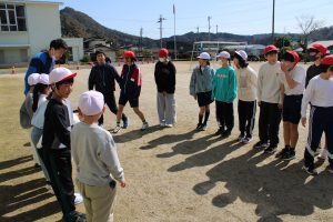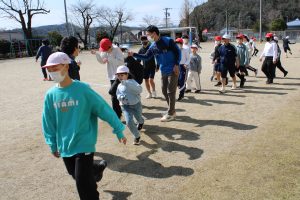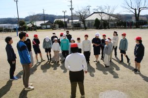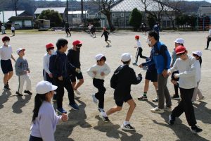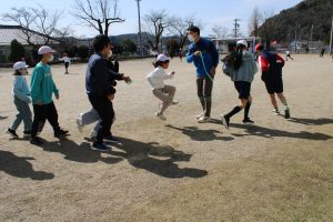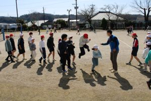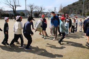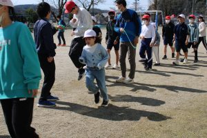 6年生の卒業も迫ってきました。6年生のみんなは、卒業前に全校のみんなと一緒に遊んで楽しい時間を作りたいという思いがあります。今日は、6年生が1年生と一緒になって大縄の8の字跳びに挑戦しました。6年生の間に1年生が入り、リズムよく連続とびをして交流しました。