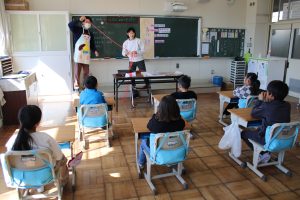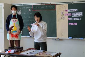 1年生で、「うんちのひみつ」と題して、養護教諭が授業を行いました。体の中で、食べたものがどのようになっていくのかを、簡単な模型を使って学びました。健康で元気に生活するために、排便が大切であることに気付くことができました。