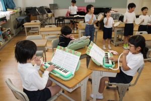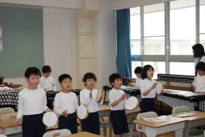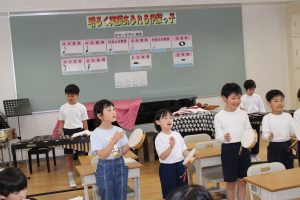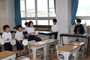 2年生の音楽では、「アイ アイ」の合奏に取り組んできました。今日は、練習の成果を披露してくれました。リズムに乗って楽しそうに演奏している姿がきらきらしていました。