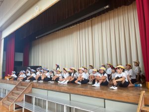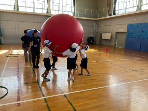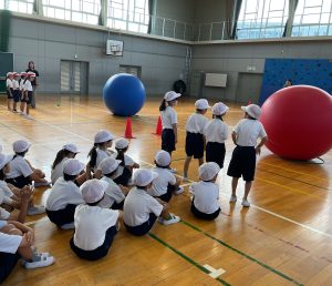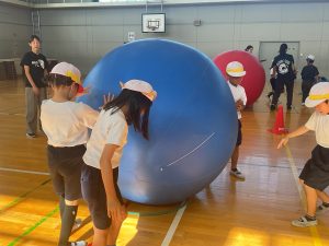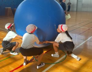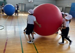 子どもたちは、体育館に入場して大きな大玉を見るなり、目をキラキラさせていました。初めて触った大玉の感想を聞くと、学年の半分くらいの子が、「思ったより重かった」と言っていて、半分くらいの子は「軽かった」と言っていました。つるつるしていて持ちにくい大玉ですが、仲間と協力すれば大丈夫です。今回経験したことをもとにして、どんな作戦を立てるか楽しみです。