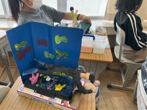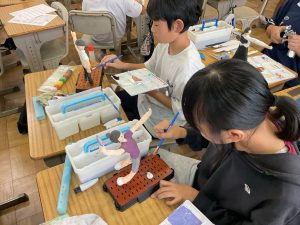 図画工作の「未来のわたし」の学習では、自分の10年後の未来を想像して、人間の骨組みから、紙粘土で肉付けまで行いました。