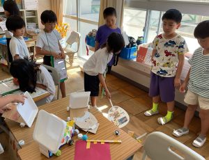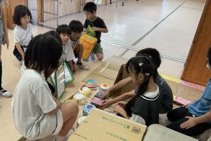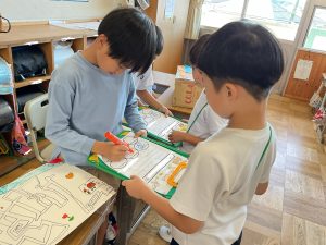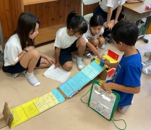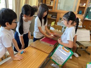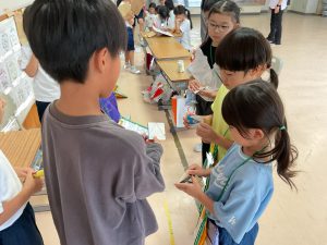1年生の子たちに喜んでもらうためにどんなお店にするか考え、1年生に遊び方を説明する人などの役割分担をして取り組みました。最初は緊張する様子がありましたが、だんだんと上手にお話しすることができました。最後には、1,2年生で感想を発表しあいました。どの子も「楽しかった。」「緊張した。」「成功して嬉しかった。」と教えてくれました。2年生として1年生に色々なことを教えている姿が素敵でした。今回の学習をいかして、国語の授業で「おもちゃの作り方」の説明書を完成させていきます。
