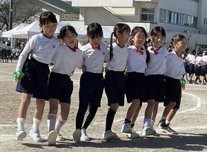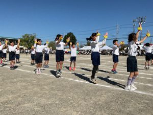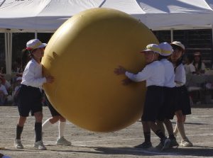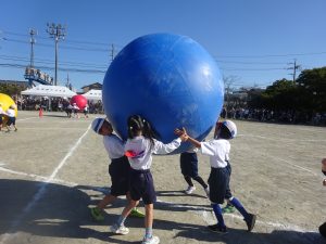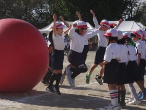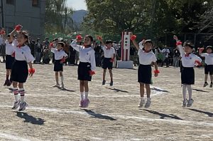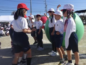 晴天の中の運動会、2年生は大玉運びとダンスを全力で頑張りました。