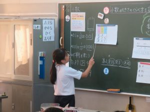 4年4組の算数では、「小数」の問題に、いろいろな考え方で挑戦する姿が見られました。自分の考えを黒板で説明したり、友達の考えを聞いて「なるほど」とうなずいたりするなど、互いに学び合うあたたかい雰囲気の中で、子どもたち一人ひとりが意欲的に取り組んでいました。