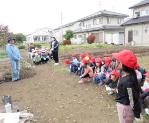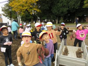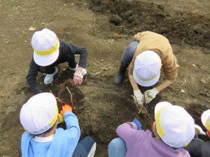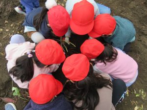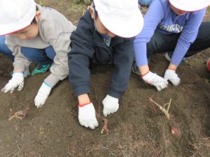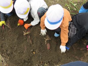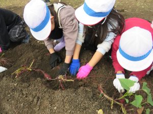 いもほりに行きました。大小さまざまないもがありましたが、子どもたちは土の感触を楽しみながら、一生懸命いもをほっていました。大きないもは、周りの子と協力しながらほり進め、見事に抜けた時には「やったね!」「よかったね!」と喜び合っていました。ボランティアの方々にも助けていただきながら、自分たちで収穫できたことに子どもたちは、満足そうでした。