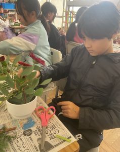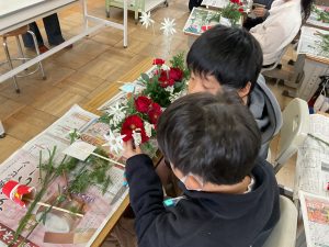 講師の皆様から、真っ赤なガーベラやバラなど、様々な花をいただきました。子どもたちは、自分だけの作品づくりに夢中でした。また、花だけでなく、クリスマスにちなんだサンタクロースやメッセージカードの作り方も教えていただきました。