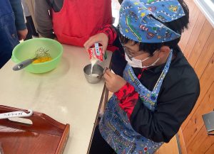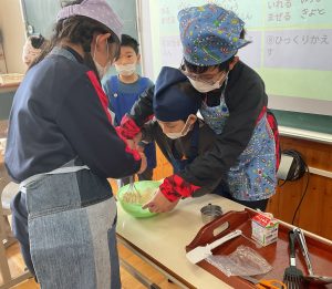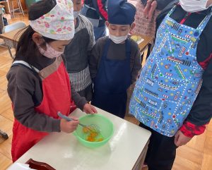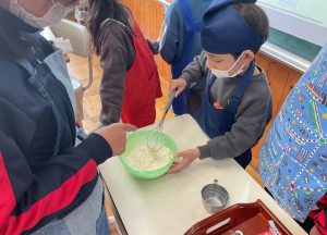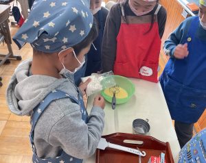 下学年の子が生地をうまく混ぜられないのを見て、上学年の子が後ろからそっと手を添えて一緒に混ぜる素敵な姿がありました。
