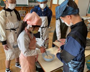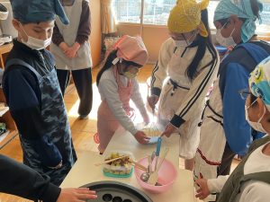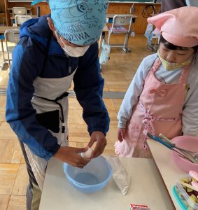順番に卵、牛乳、ホットケーキミックスを入れたり、混ぜたりしました。やりたい人が何人かいた時に「どうぞ」とゆずる素敵な姿も見られました。