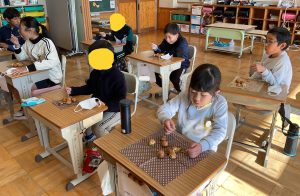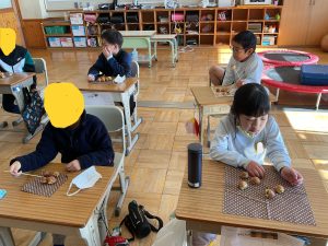 「いくつできたか数えて。」「22個!」 「何人いる?」「1,2,3、、、7人!」 「22÷7=?」・・・「3!!」と算数もして、