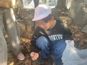 図工の時間に、「ひみつのすみか」の作品づくりを行っています。子どもたちは、自分だけのイメージを形にするために、まず材料集めからスタートしました。憩いの森や天乳池周辺で木材を見つけると、「これを壁にしようかな」「屋根に使えそう!」と、思い思いのアイデアを膨らませていました。
