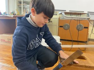 また、制作の過程では、のこぎりの使い方も学習しました。初めて扱う児童も多く、最初は緊張した面持ちでしたが、かものスクールサポーターの方の話をよく聞き、安全に気をつけながら丁寧に木材を切る姿が見られました。切れた瞬間には「できた!」と嬉しそうな声も上がり、自信につながっているようです。完成に向けて、子どもたちがどんな工夫を見せてくれるのか、とても楽しみです。