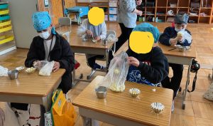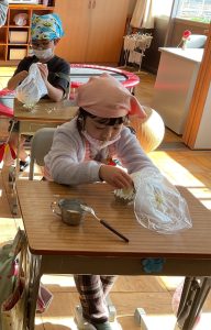 ポリ袋に入れたさつまいもをつぶしたり、牛乳を自分の好みの柔らかさになるように少しずつ入れたりしました。