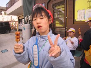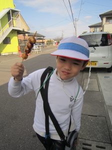 自分で買うのは、ドキドキしたけど、おいしいおだんごを食べてにこにこ笑顔でした。
