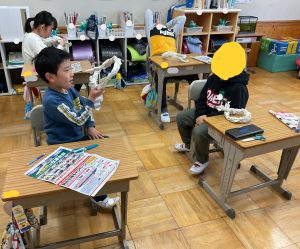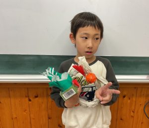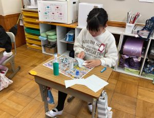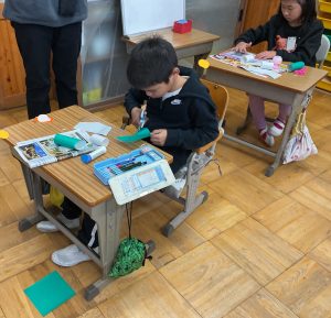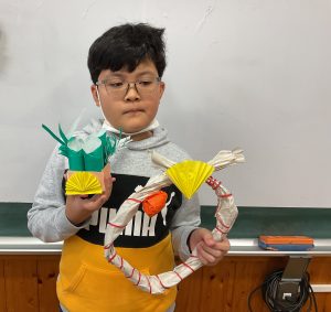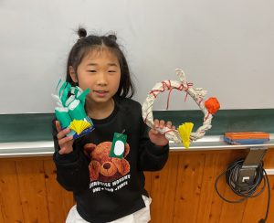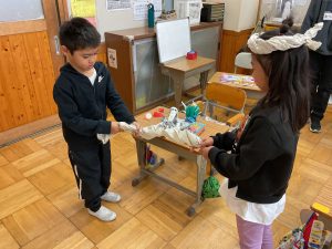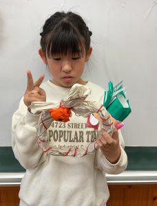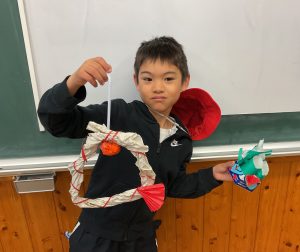 しめ縄は、二人一組になって、ねじっていきます。その時「持っててね。」と声をかけて協力して作る姿が見られました。