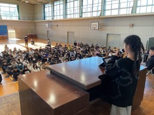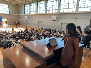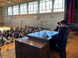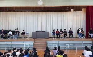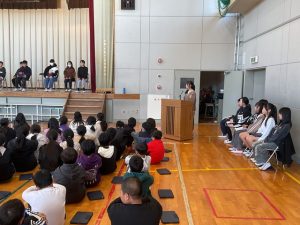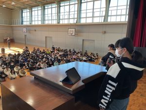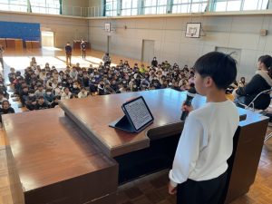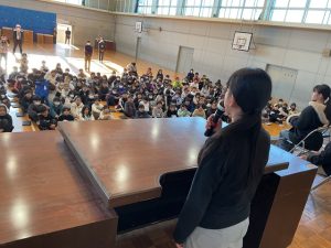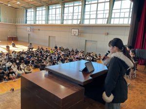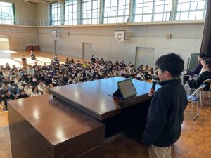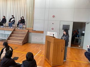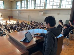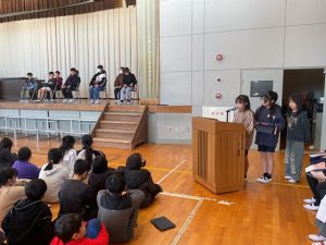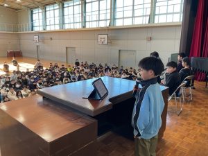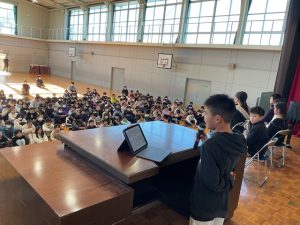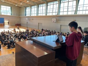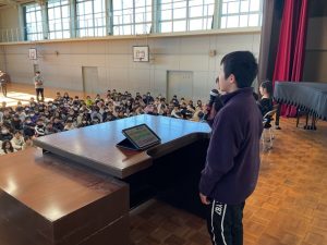 今週は来年度の委員長選挙が行われ,4・5年生が体育館に集まる中,立候補者は堂々と演説することができました。