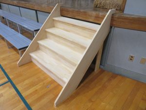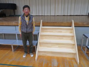 かねてから、体育館のフロアからステージに上がる階段の老朽化が心配されていました。この様子を知った、かものスクールサポーターのお一人が階段を作ってくださり、この度納品してくださいました。