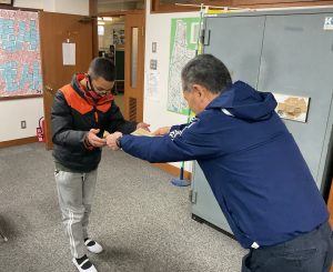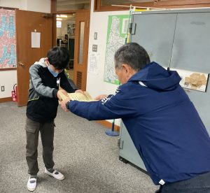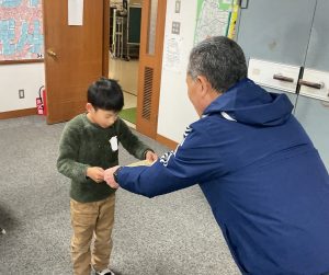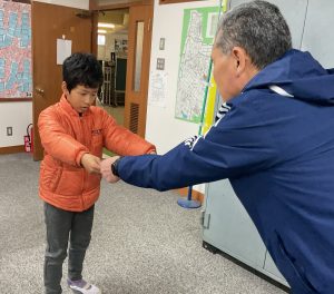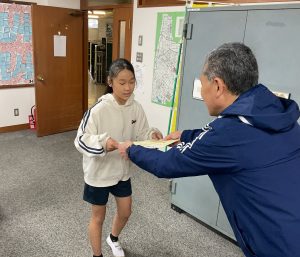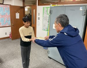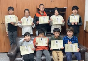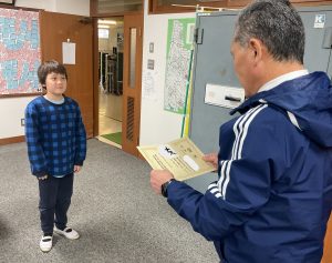 12月25日(木)夏休み前後に書写で取り組んだ「全国書画展」の毛筆 応募作品で、金賞を受賞した子の表彰が校長室で行われました。