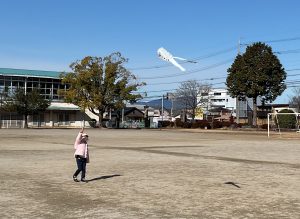 風が弱いときは走って揚げて、風が吹いたらうまく風をつかまえて揚げて、楽しんでいました。