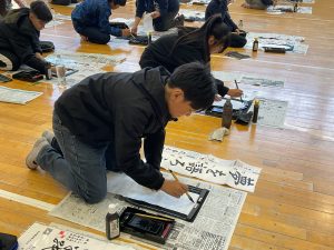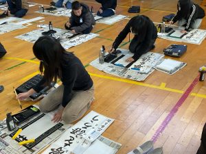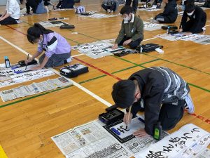 小学校最後の書初め会では、静かに、そして真剣な表情で筆を運ぶ姿が印象的でした。「夢を語ろう」という言葉に思いを込めて一生懸命書き上げることができました。