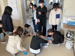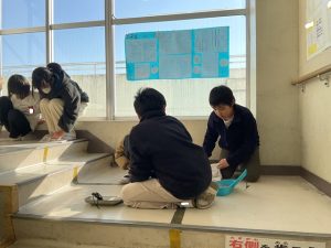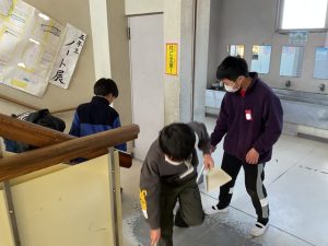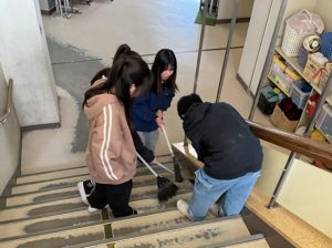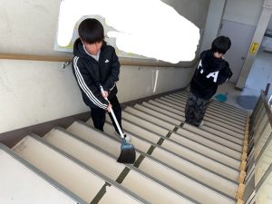 掃除中に行われた訓練の後,廊下や階段の砂を掃除する素敵な姿がありました。